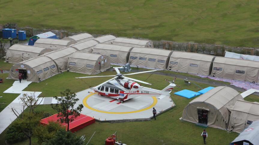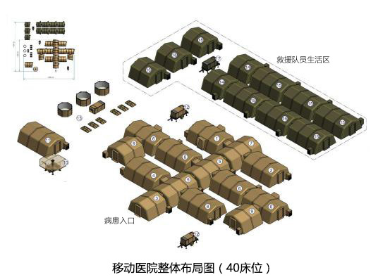 上海东方医院移动医院系统,由10余个帐篷组成,呈“土”字形搭建开来,从门诊、检验、血库、药房、污物处理等一应俱全,其中,层流手术室配备了国际最先进的移动空气净化系统,达到目前移动医院野战化手术消毒灭菌的最高级别,可以开展复杂的心脏和脑外科手术,加上医院直升机和5部大型越野救援车,形成了国内唯一一家及水、陆、空于一体的整体化灾难救援医院。