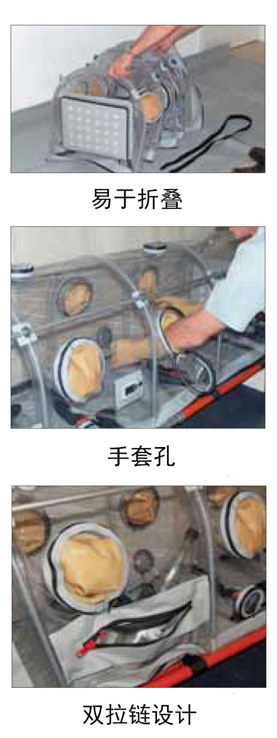 整合多种安全操作设计如:微型气闸室、手套孔和用于输液、导尿管的拉链孔等,可保障医护人员在安全的环境下对患者进行治疗