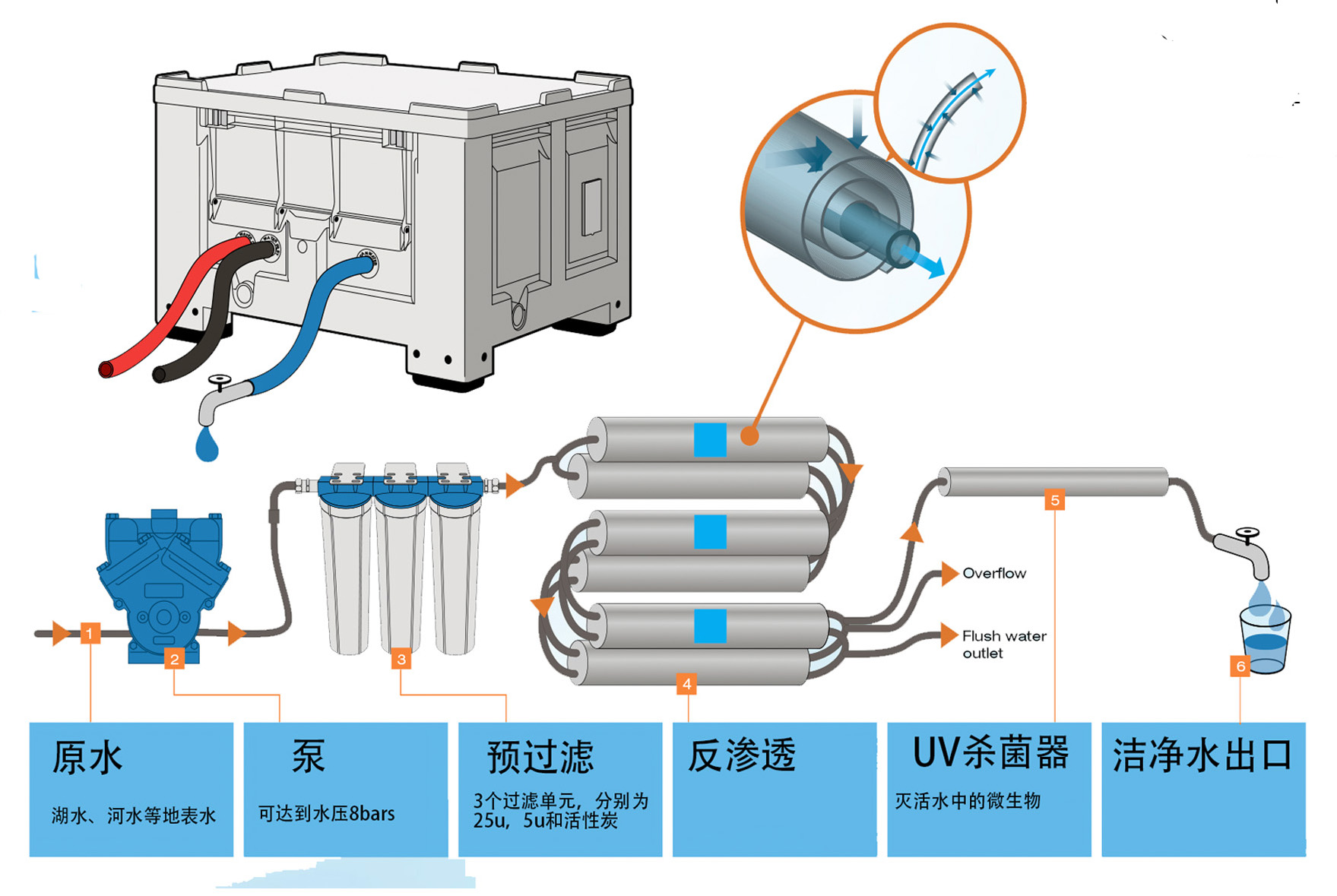 产品具有紧凑的结构设计、高度集成膜过滤、反渗透以及紫外线杀菌系统,使整套系统体积小、重量轻。
