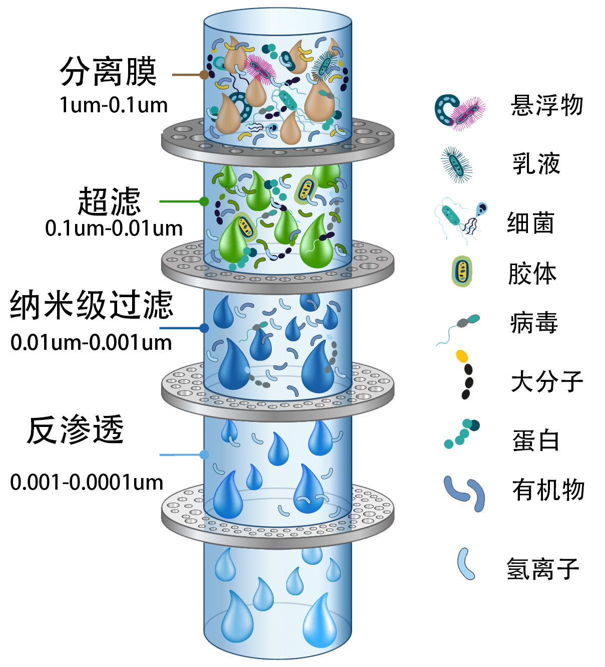 水处理设备采用的反渗透技术可移除水中的铅、铜、钡、铬、汞、铋等重金属,也可以滤除砷、氟以及农药残留。反渗透膜能阻止细菌通过,并将如大肠杆菌、贾第虫、因孢子虫等细菌与废水一起排出。